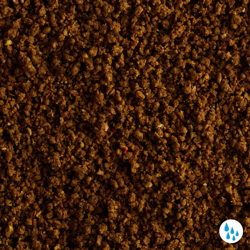 Chapelure, Maïs, PV1 (blé, mélasse), biscuit, gluten de maïs (10%), chenevis, curcuma (5%).
