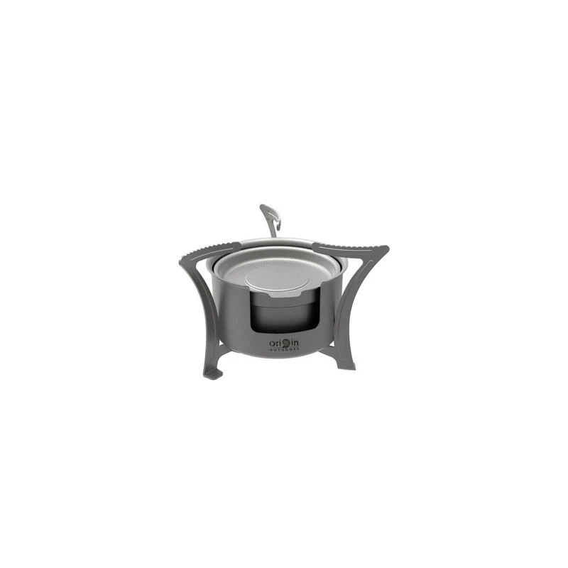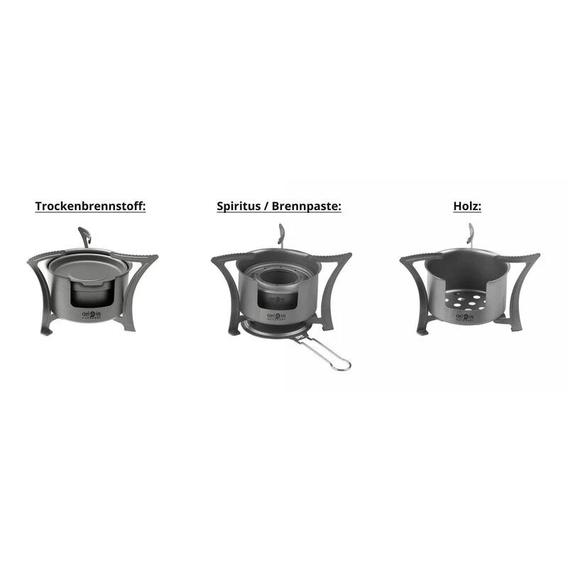 Cette ultra-légère cuisinière Titan peut être utilisée avec de l’alcool, de la pâte combustible et des combustibles solides comme le combustible sec ou le bois (plus les cubes Esbit).