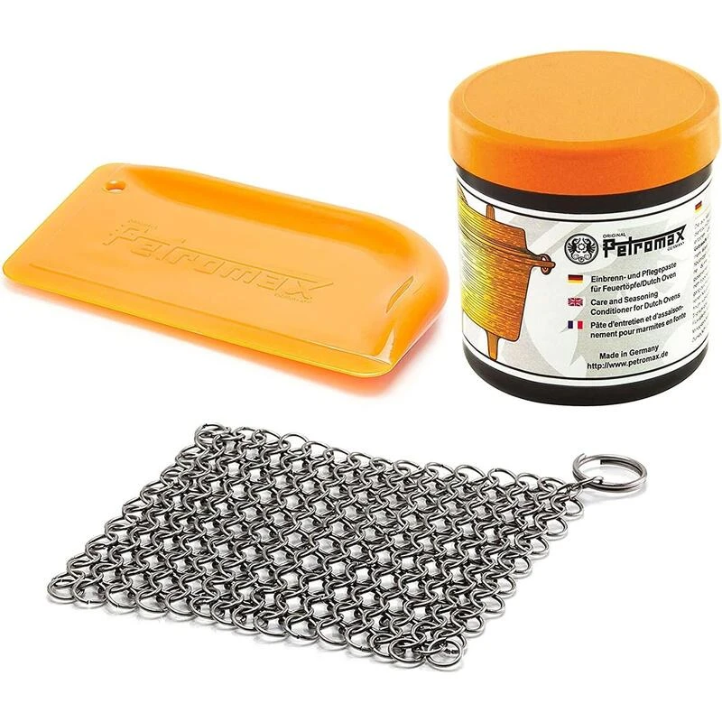 Le pratique ensemble d’accessoires Petromax Dutch Oven comprend un conditionneur d’entretien et de mise en place pour fonte, un racloir et un nettoyeur Ă mailles.